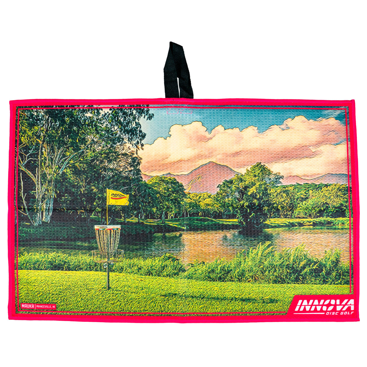 Colorful, big, absorbent. The Tour Towels are made from 100% waffle weave polyester with a high resolution color print on both sides. There are three designs (Island, Forest, and Mountain), and each has the Innova Logo with chains on the reverse side. The fabric loop in the center of the towel makes for easy attachment. Towel Measurements: 25 inches X 17 inches