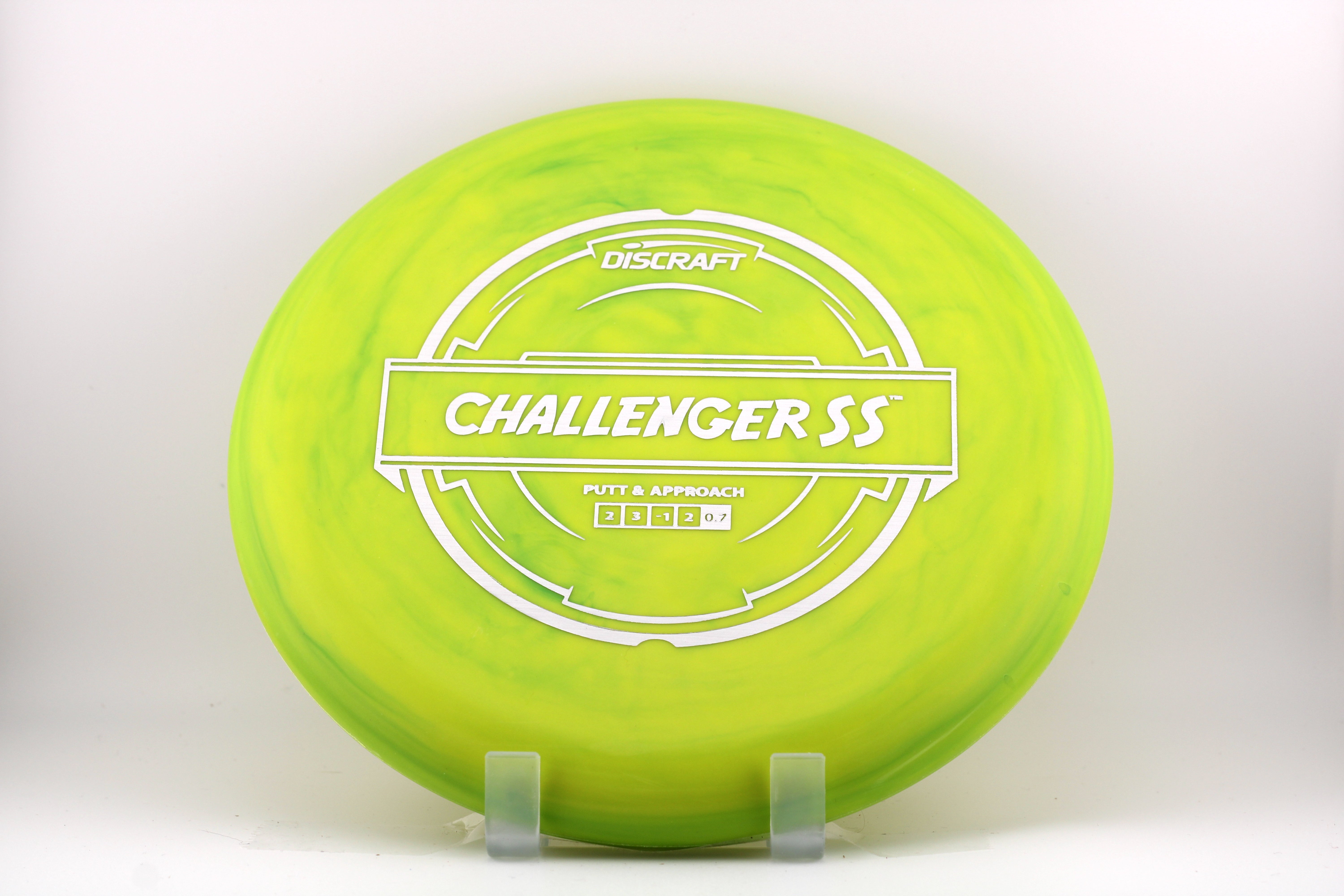 The Challenger SS is a putter originally debuted as a "Test Flight" disc during the 2017 Ledgestone Open. It is a more understable version of the popular Challenger putter, with a flat-top, rounded edge and comfortable grip.