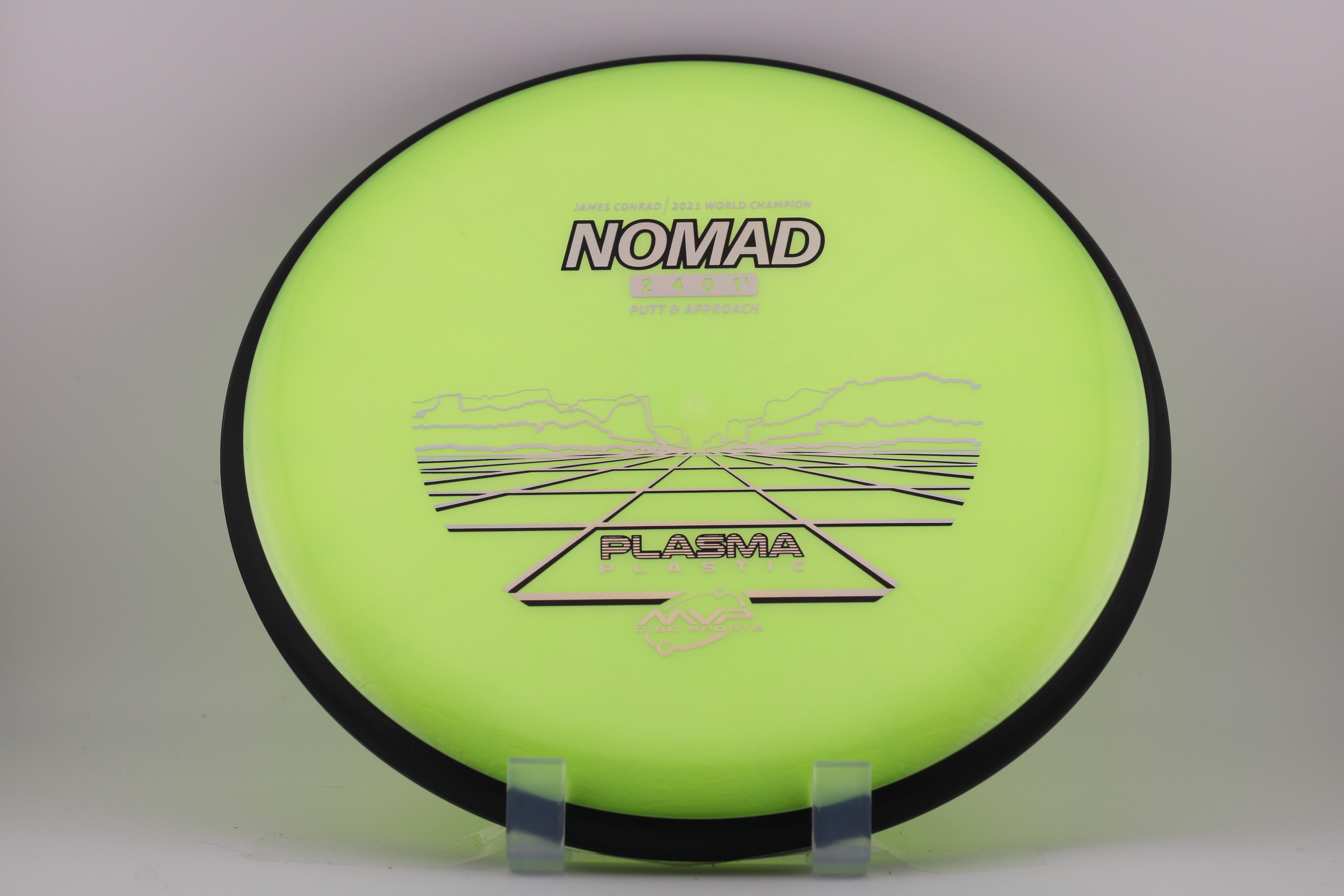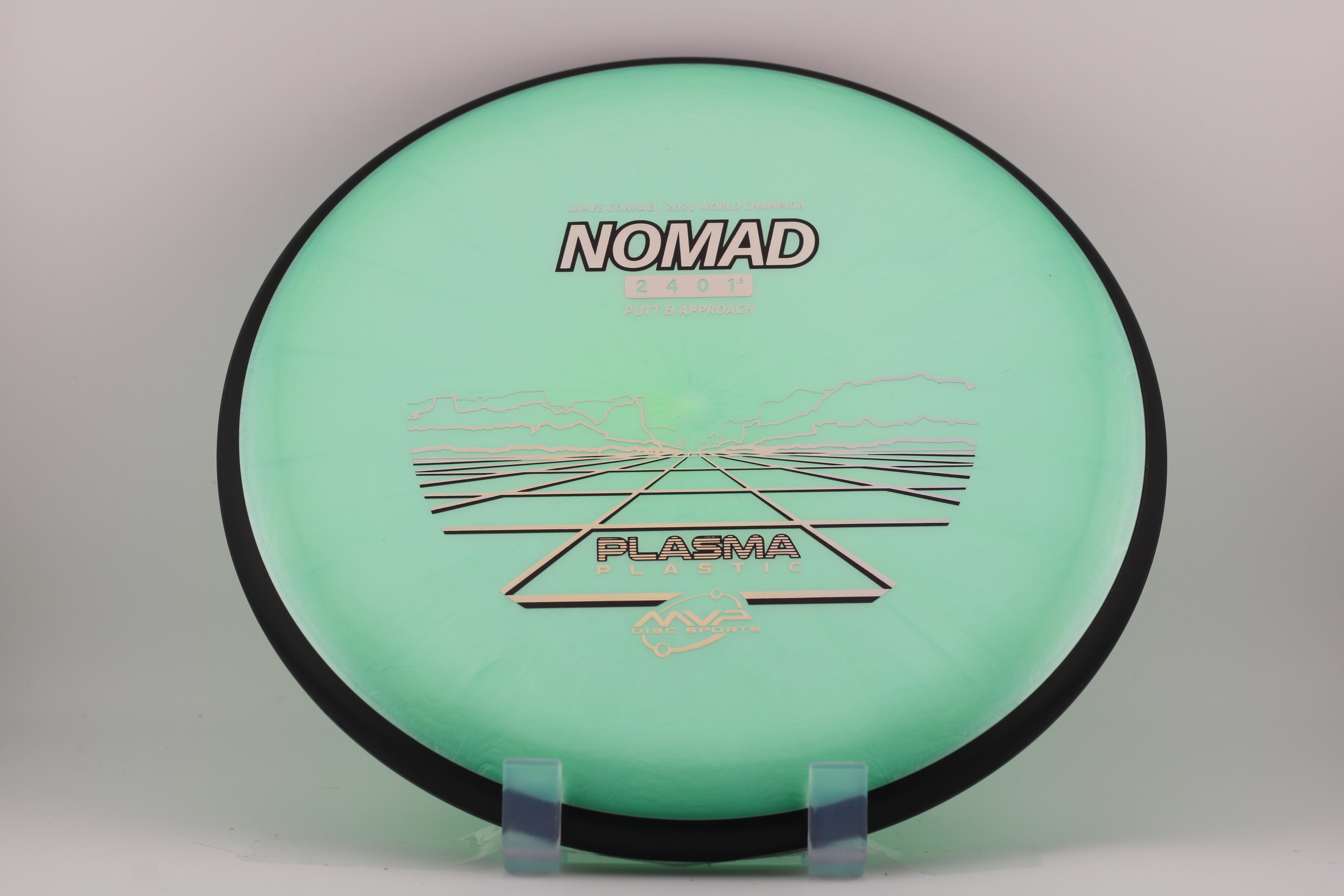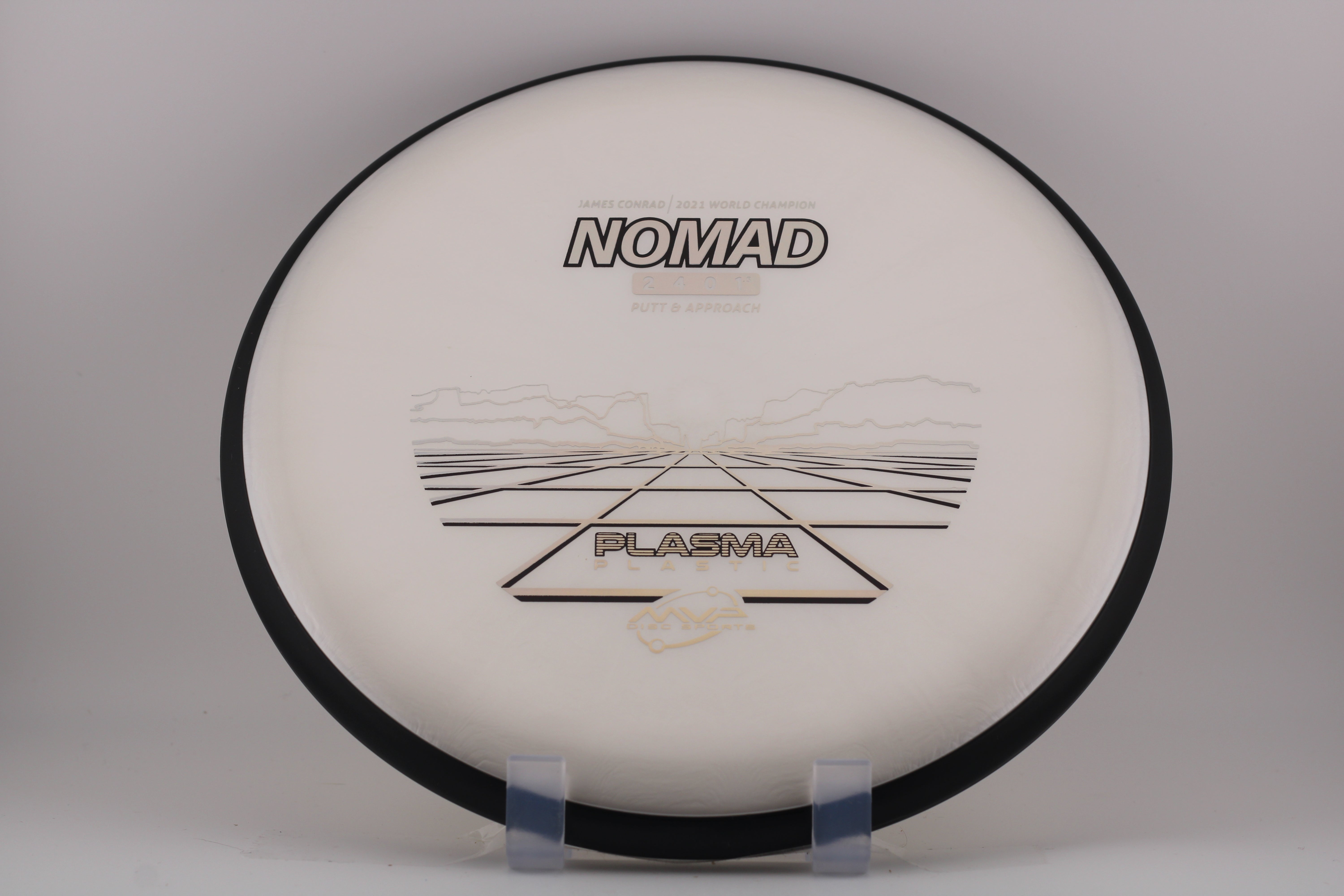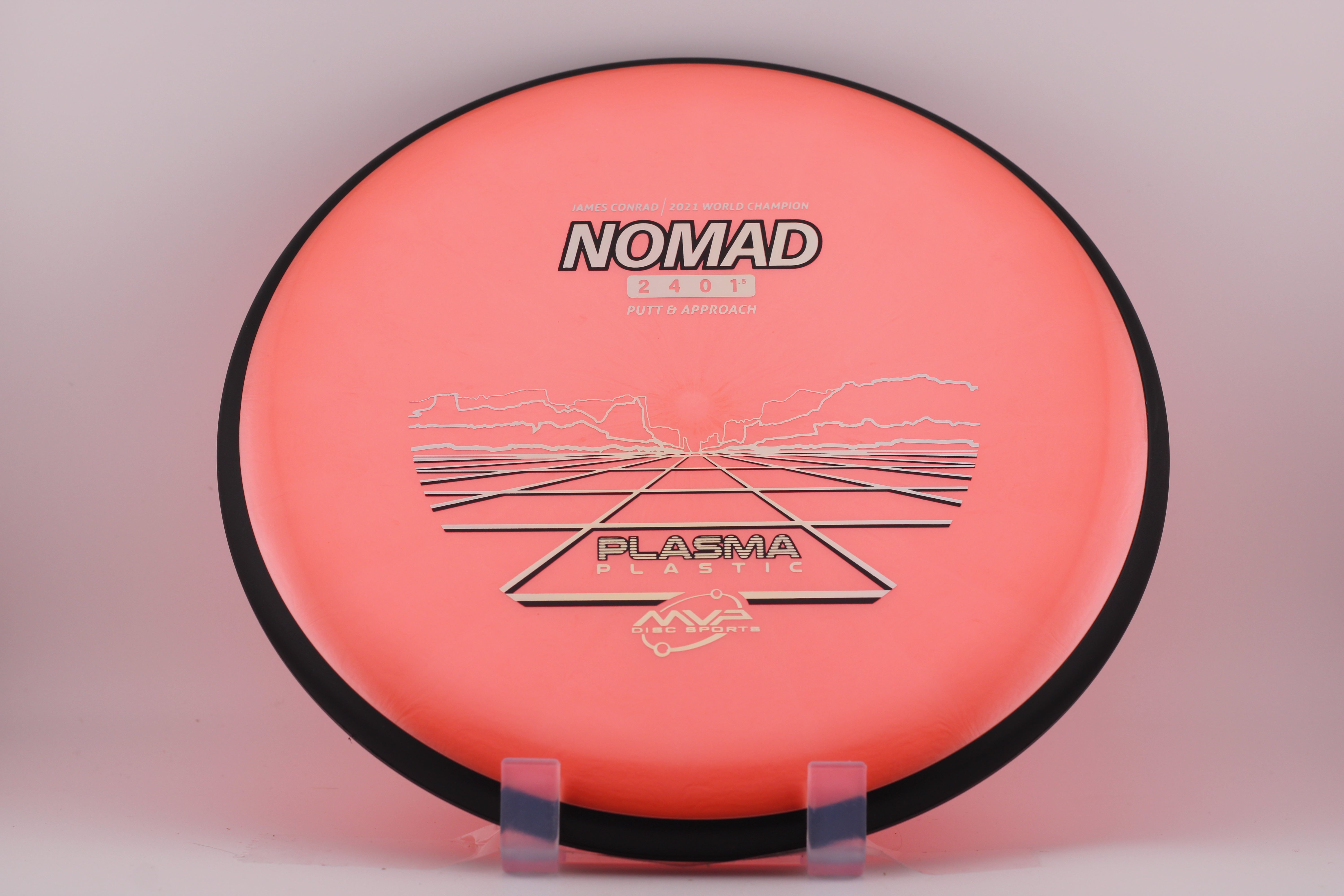The Nomad is the first disc in the James Conrad line. This putter has a small bead to provide additional longevity. The Nomad has a neutral flight on drives and a stable to overstable flight while putting, making for a go-to putter that can handle power on the drives and spin on the putts.