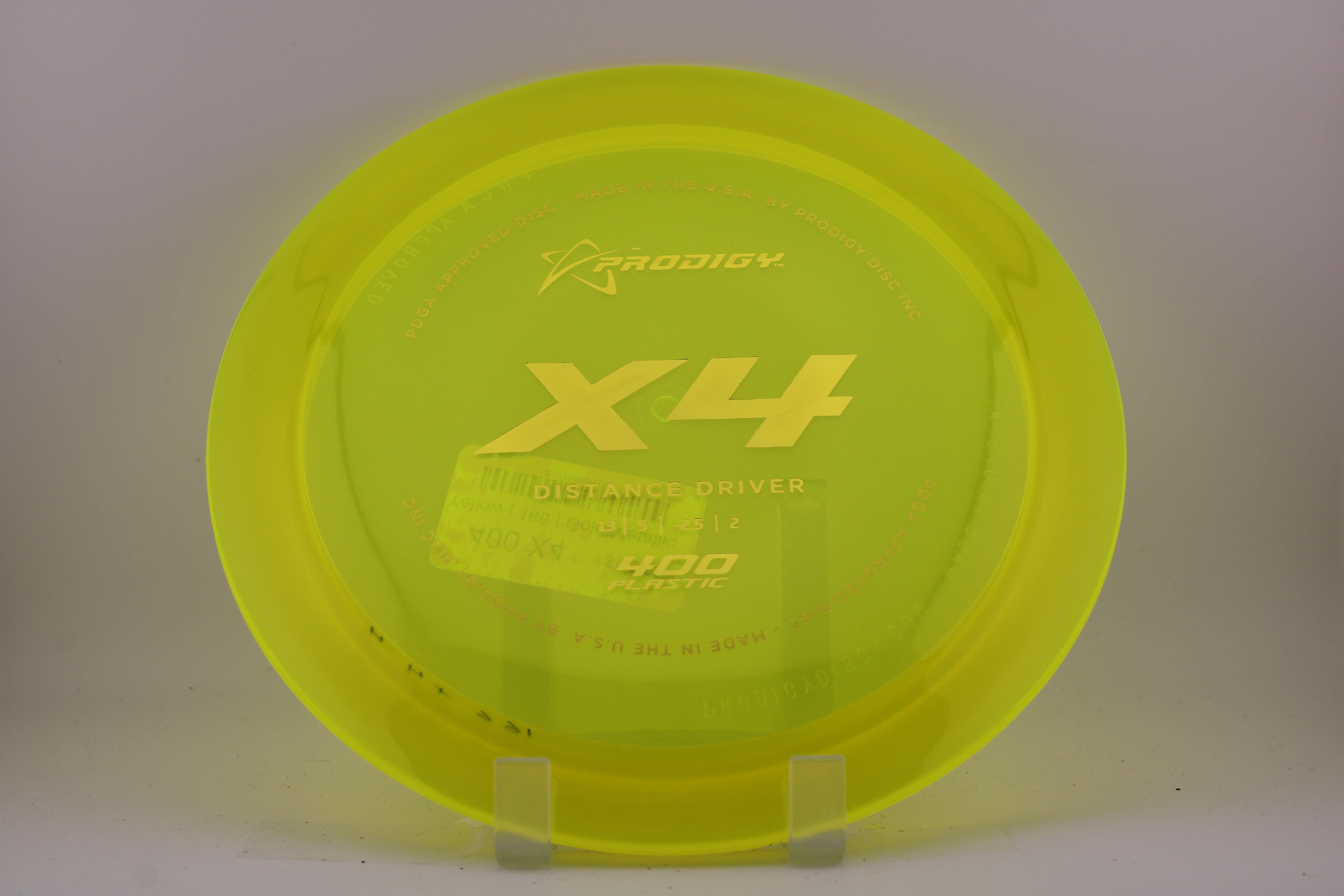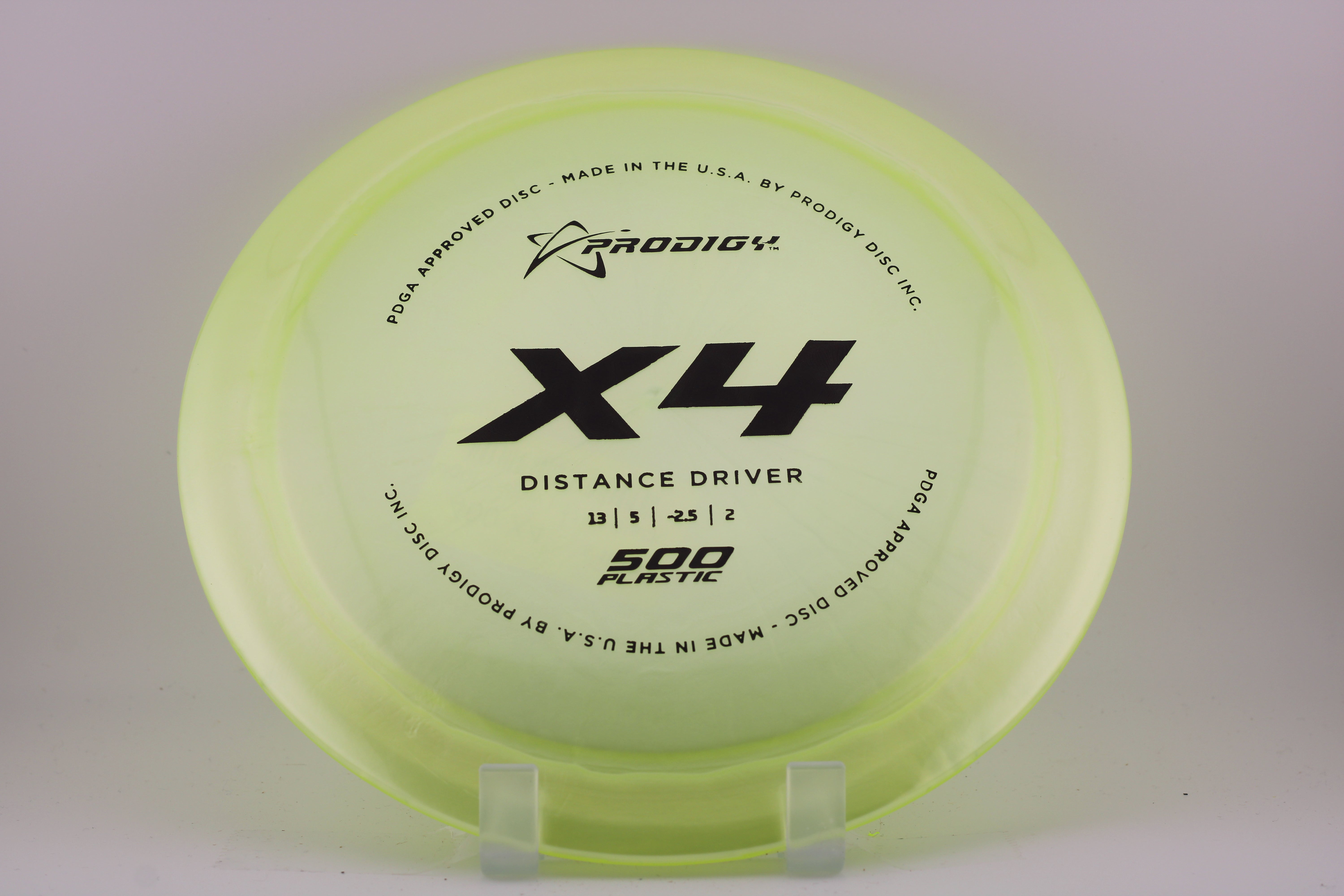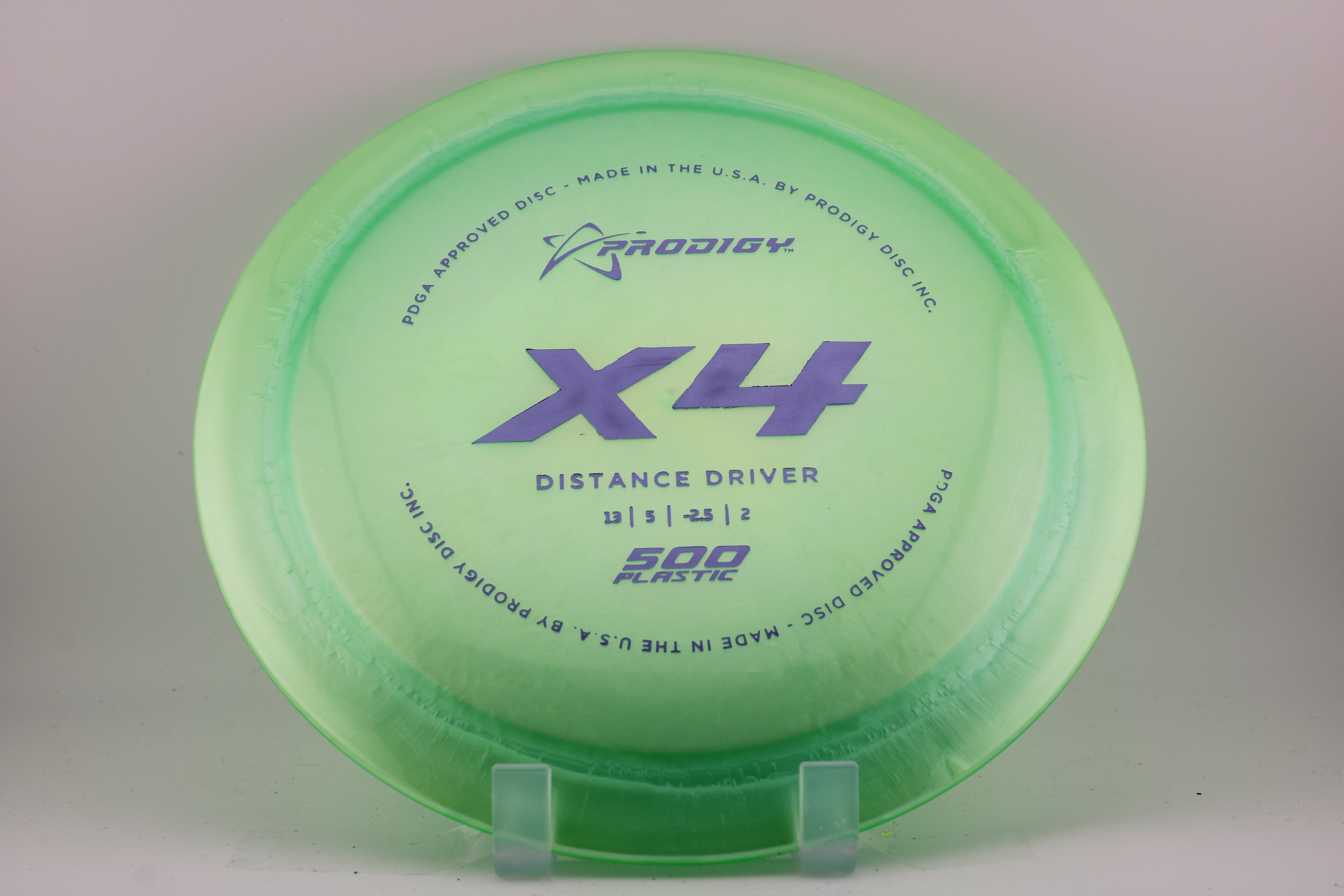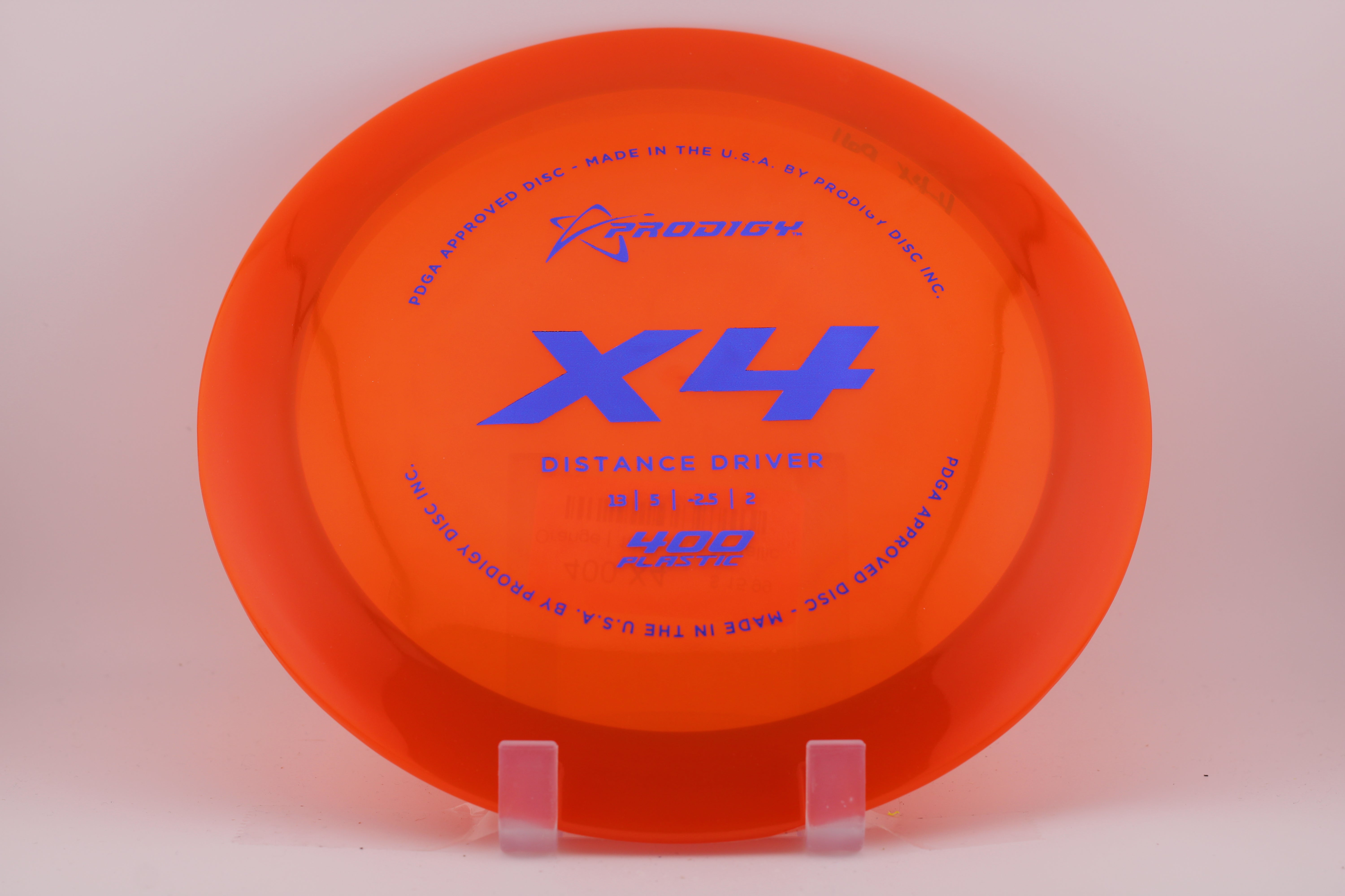 The Prodigy Disc X4 is a slightly understable, low profile, high-speed distance driver. It is great for players with lower arm speed that are looking to gain more distance. The X4 is designed to hold a turnover even at a lower speed. The X4 performs very well at low heights and in tunnel shots. For players with faster arm speed, the X4 will flip later in the flight path and is perfect for long wooded shots or accurate turnovers.