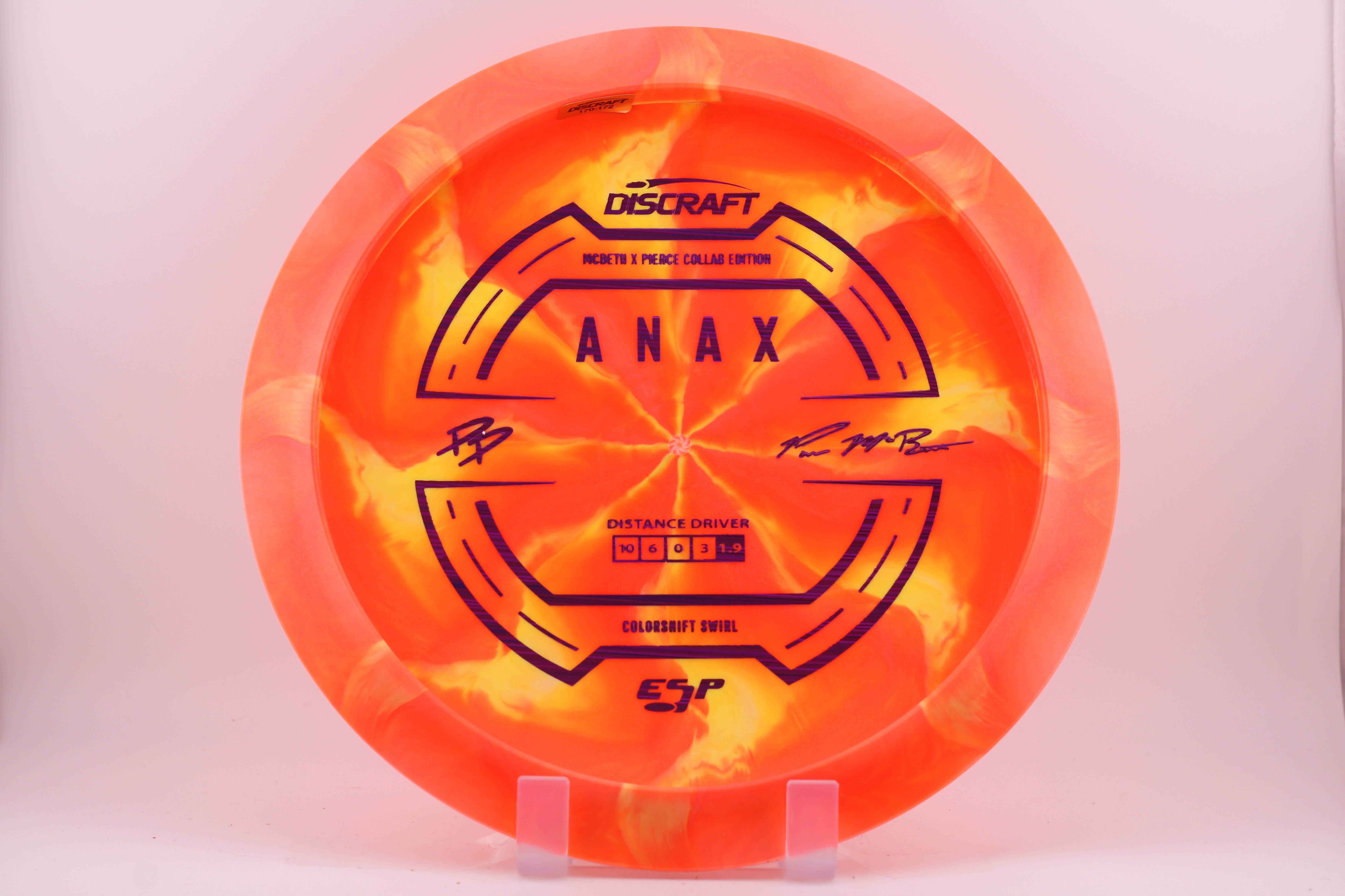 The Anax is a driver with elite carry and a trustworthy fade—now available in a special Paul McBeth & Paige Pierce GMC collab that nods to the fan-favorite “1060 Anax.” The stiff, slightly domed profile adds glide and a crisp, connected release. Complimening the original release, you’ll find a bottom stamp that lets the swirls and color patterns take center stage.