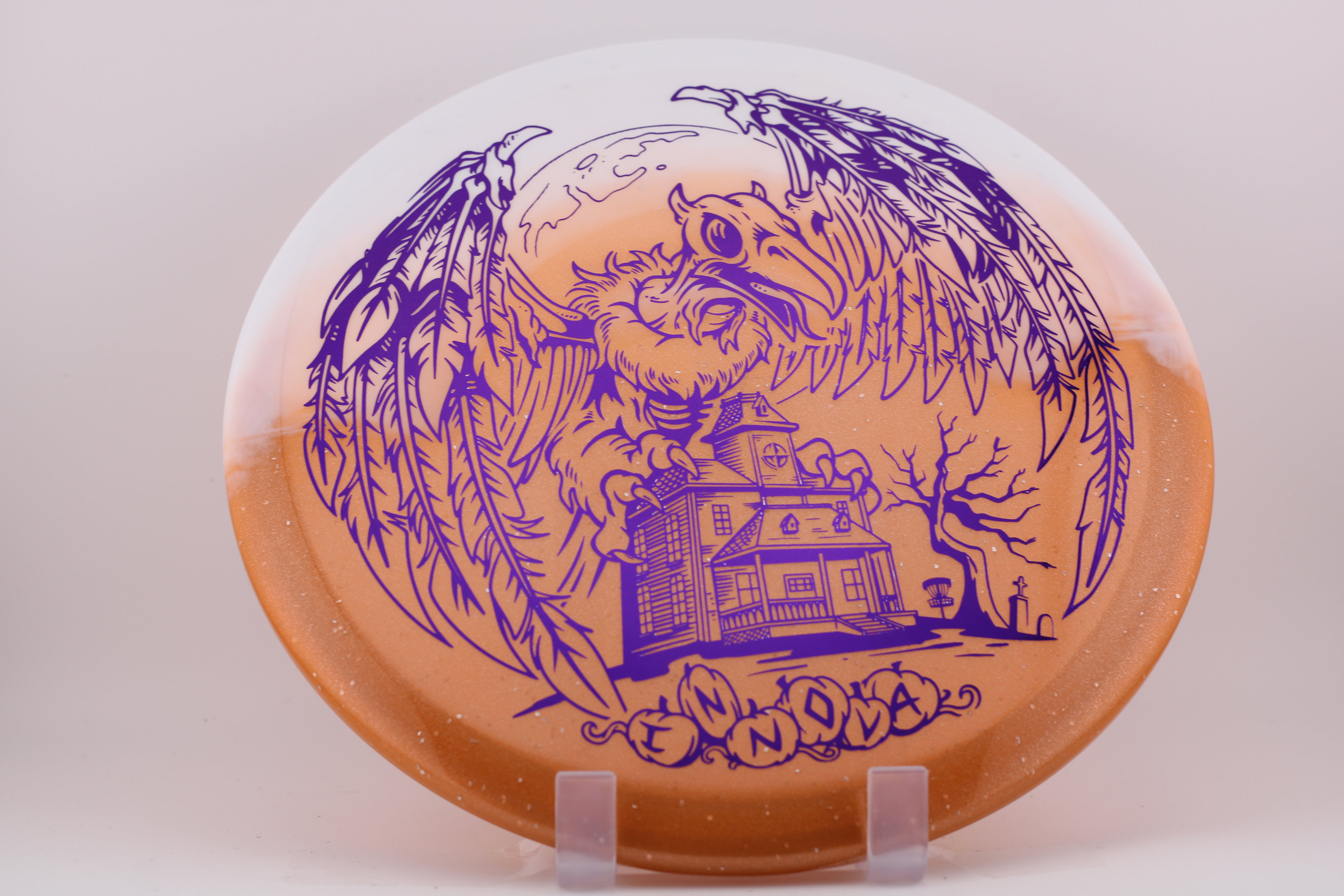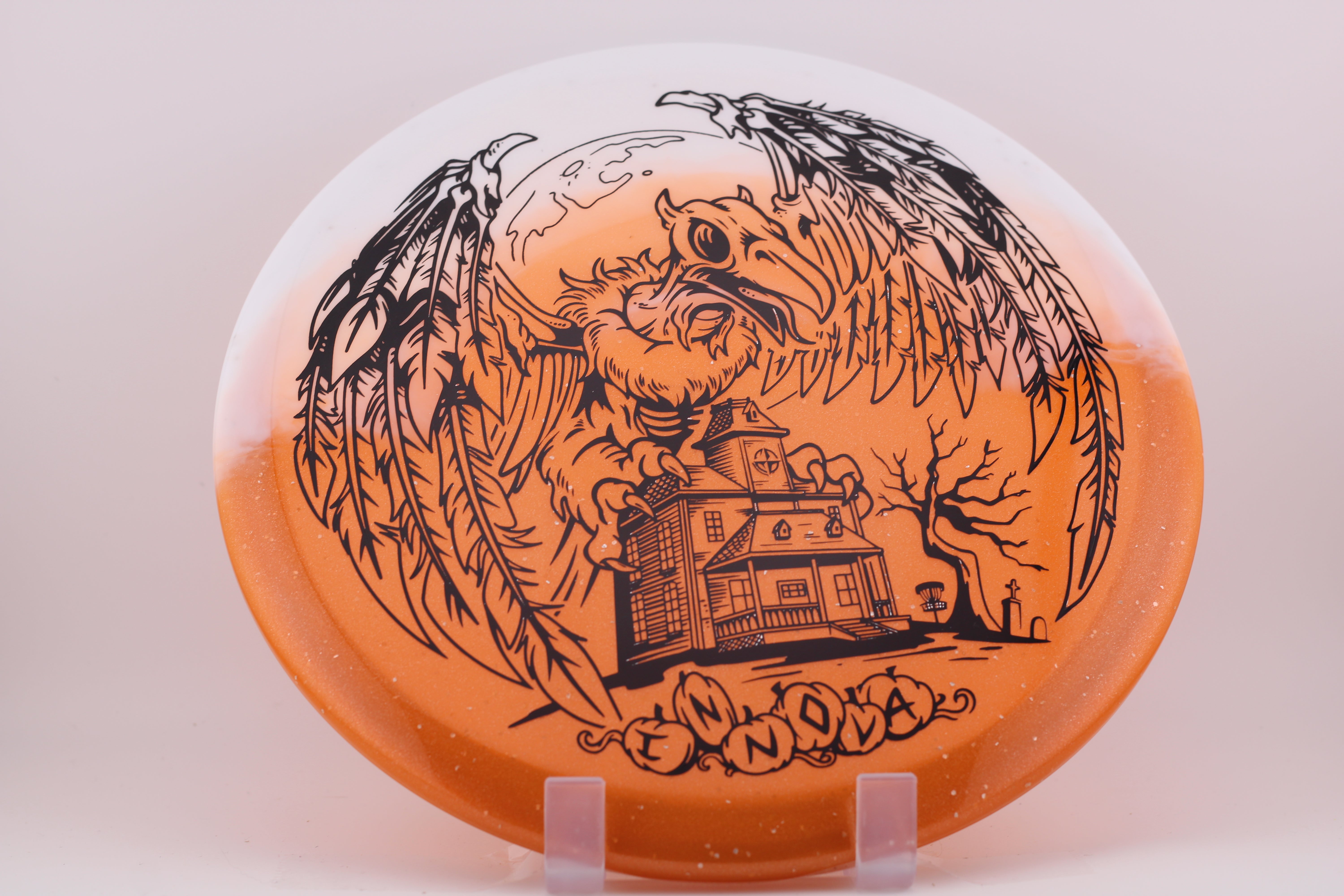 This Roc3 features "Duo", Innova's newest molding process. Every disc is a unique blend of white Star and orange Metalflake materials forming one hauntingly beautiful disc. Then, you add the scary-oversized XXL Halloween Roc stamp and now you have a treat for collectors and players.