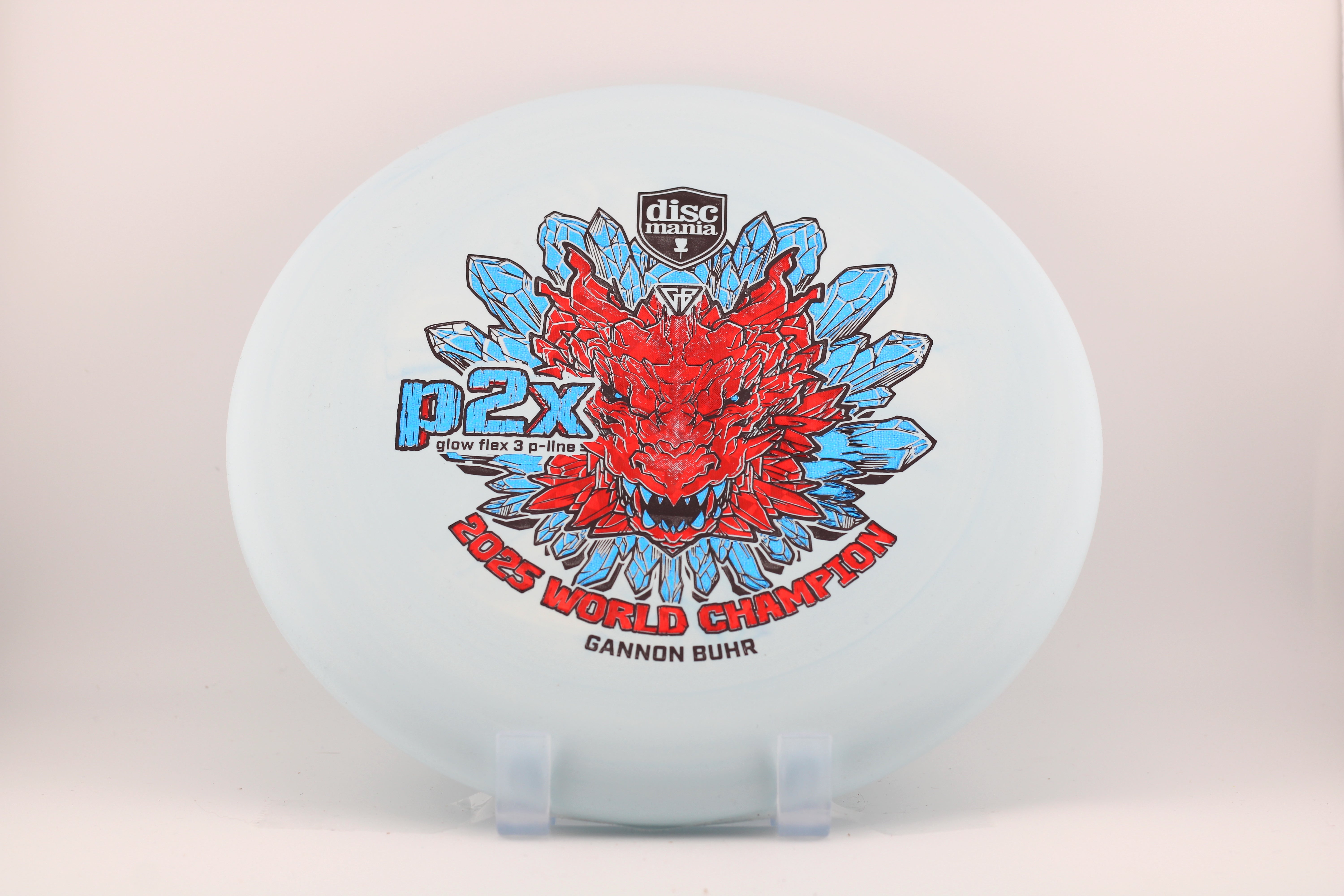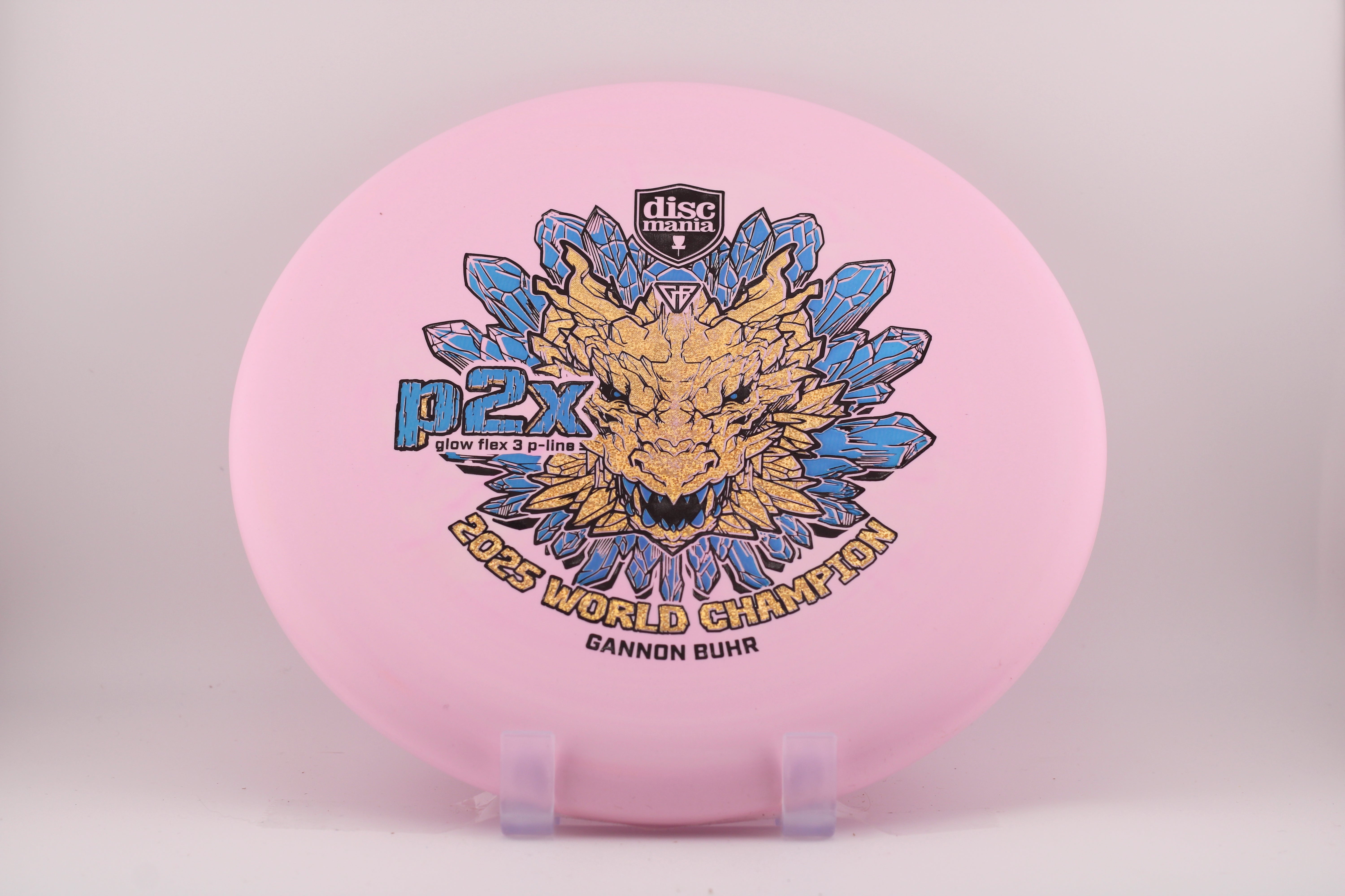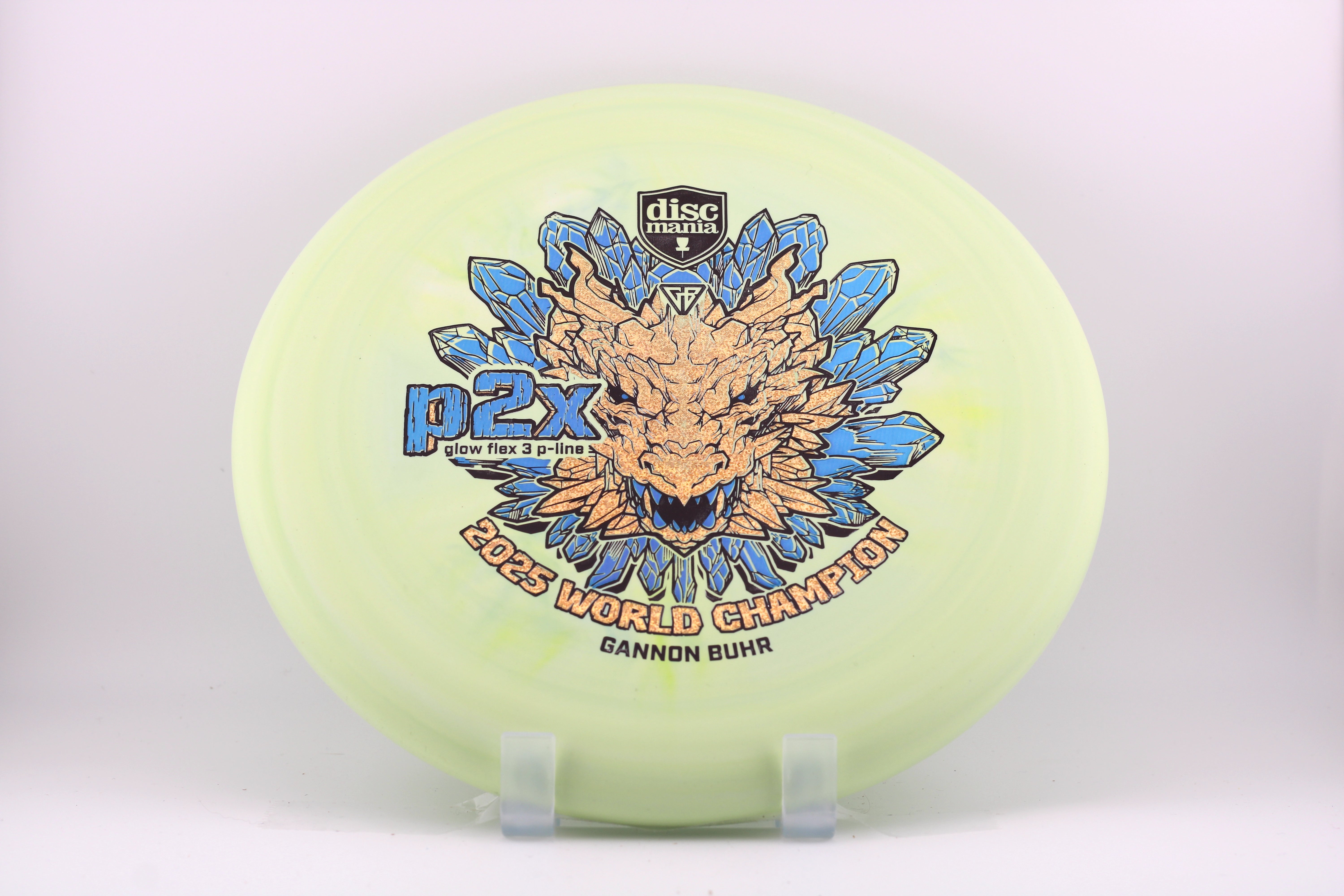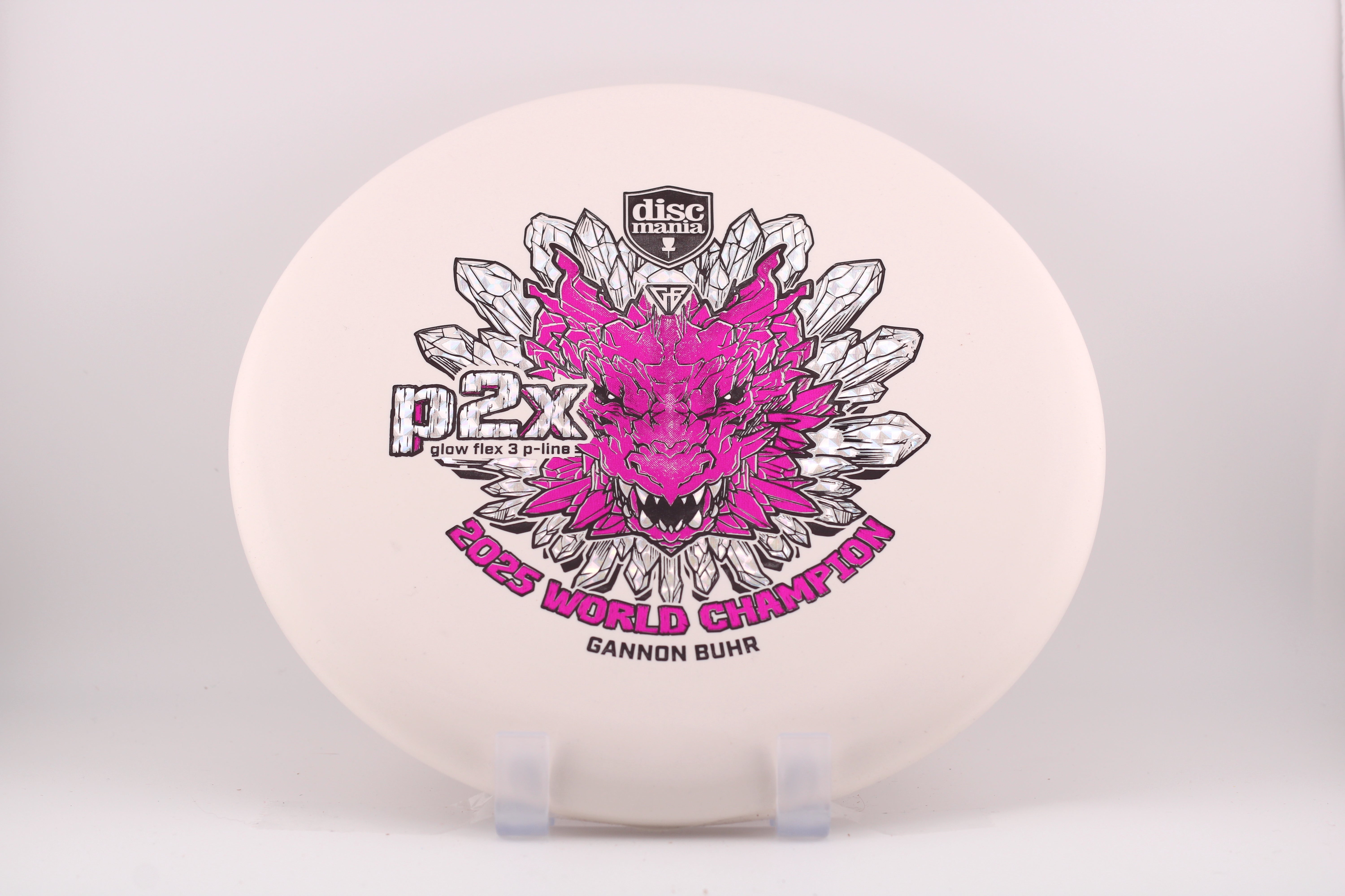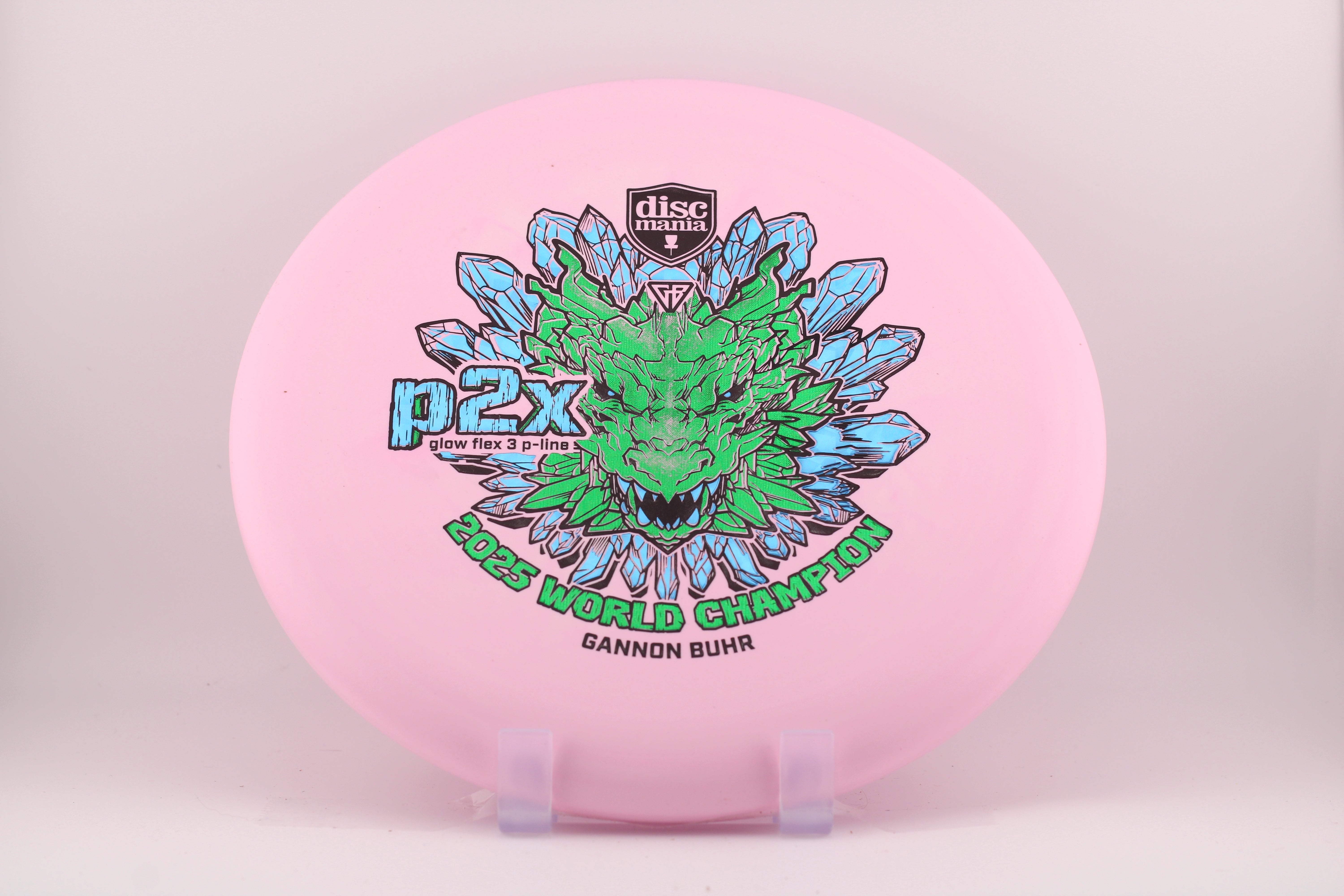 For the first time the P2x is available with the stiffest version of the Discmania P-Line plastic. It’s the most durable base plastic ever made. It offers an exceptional combination of grip, durability, and performance, making it a perfect choice for players who want reliable feel and consistent flight paths. A fierce dragon head symbolizes power, strength and dominance. Just like what we saw from Gannon at the 2025 Worlds in Finland. Now it’s your time to pick up a piece of disc golf history.