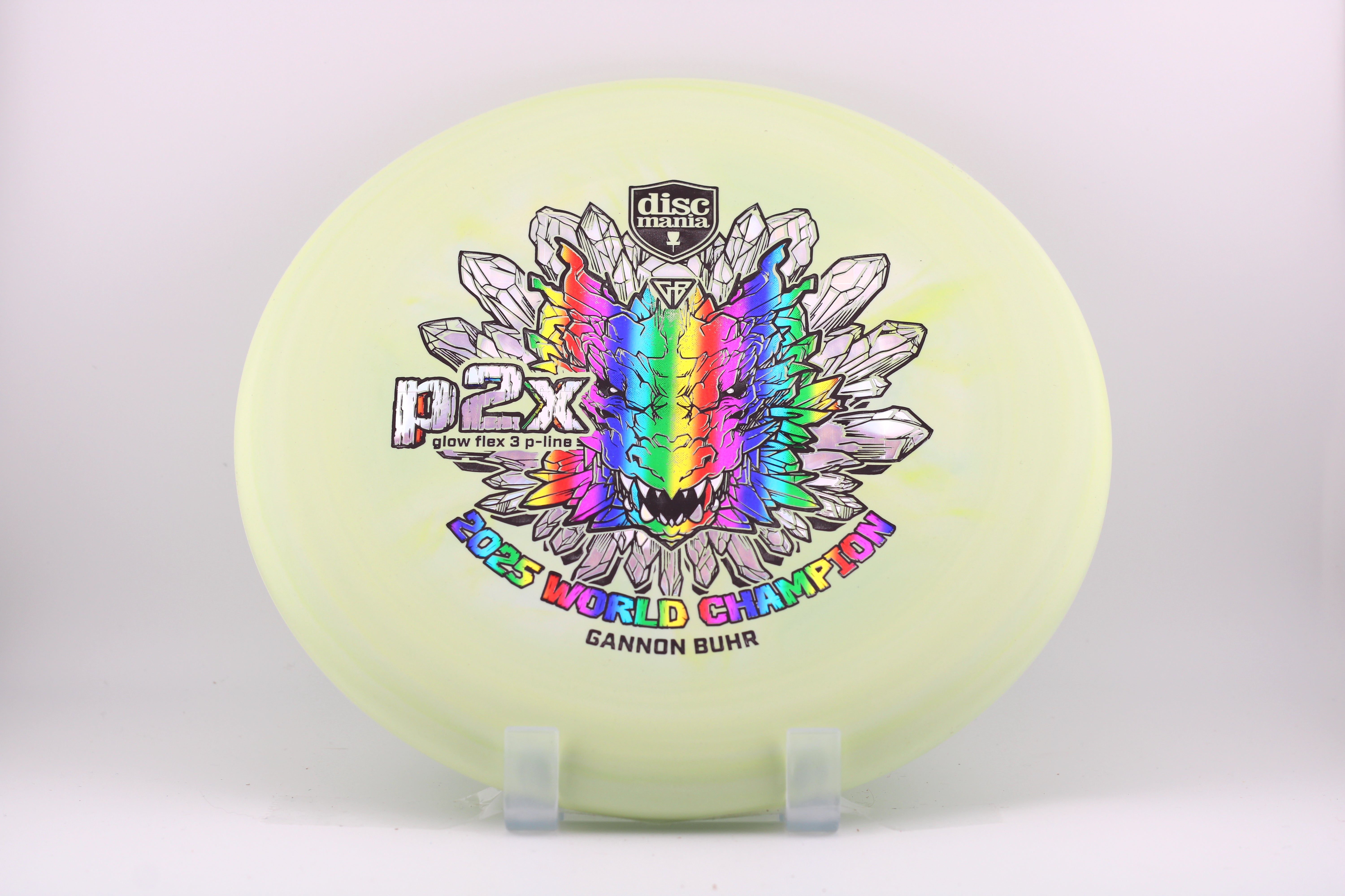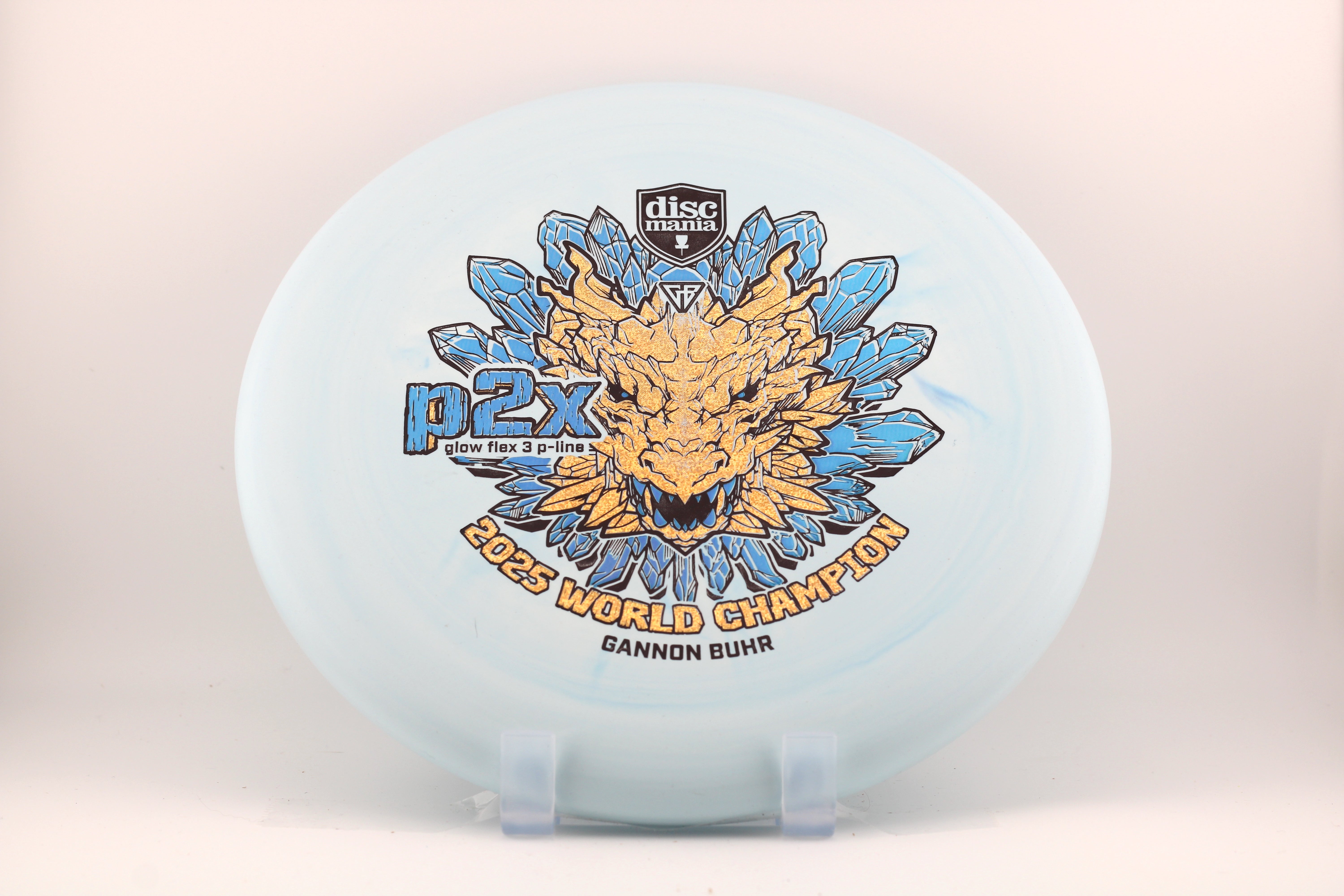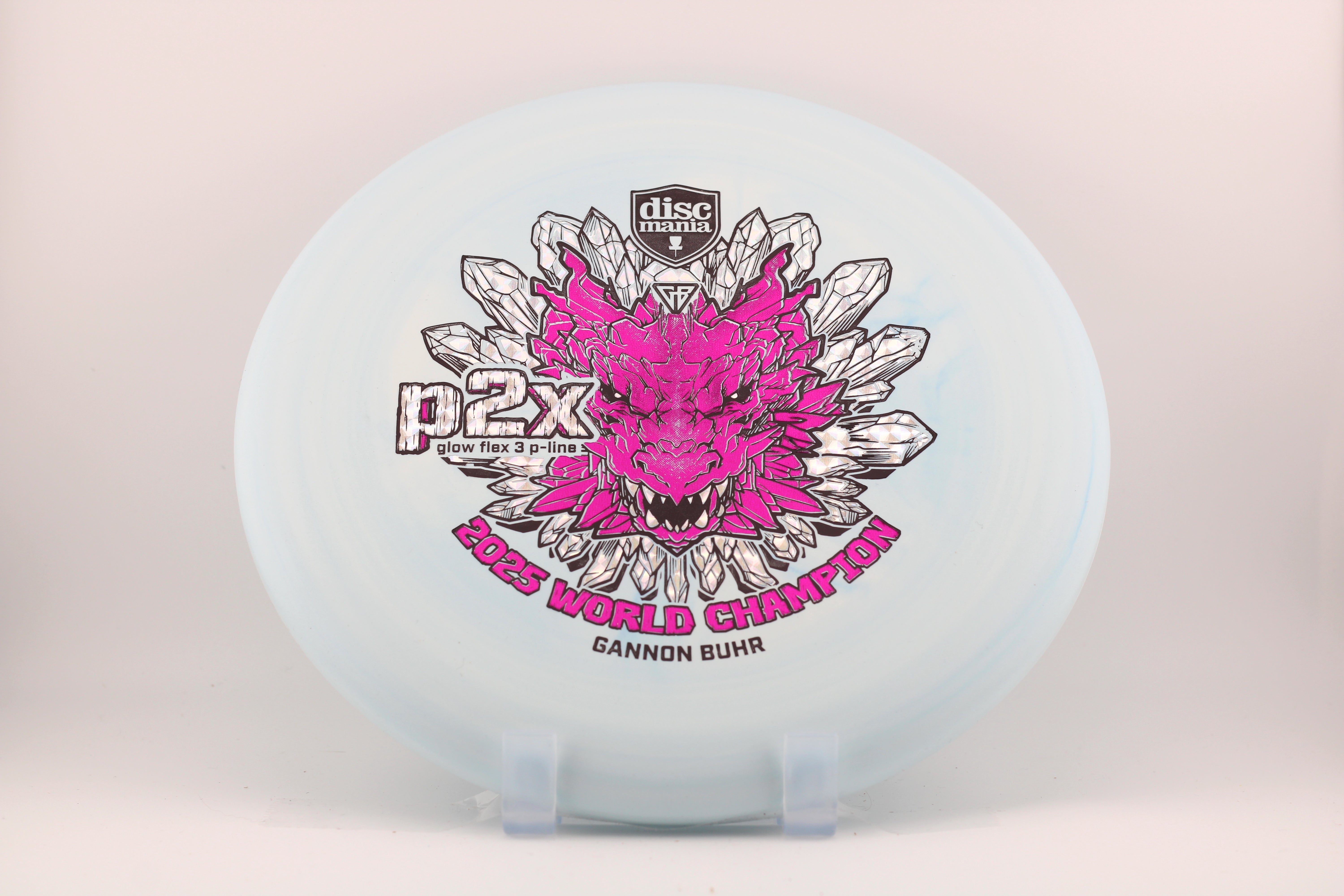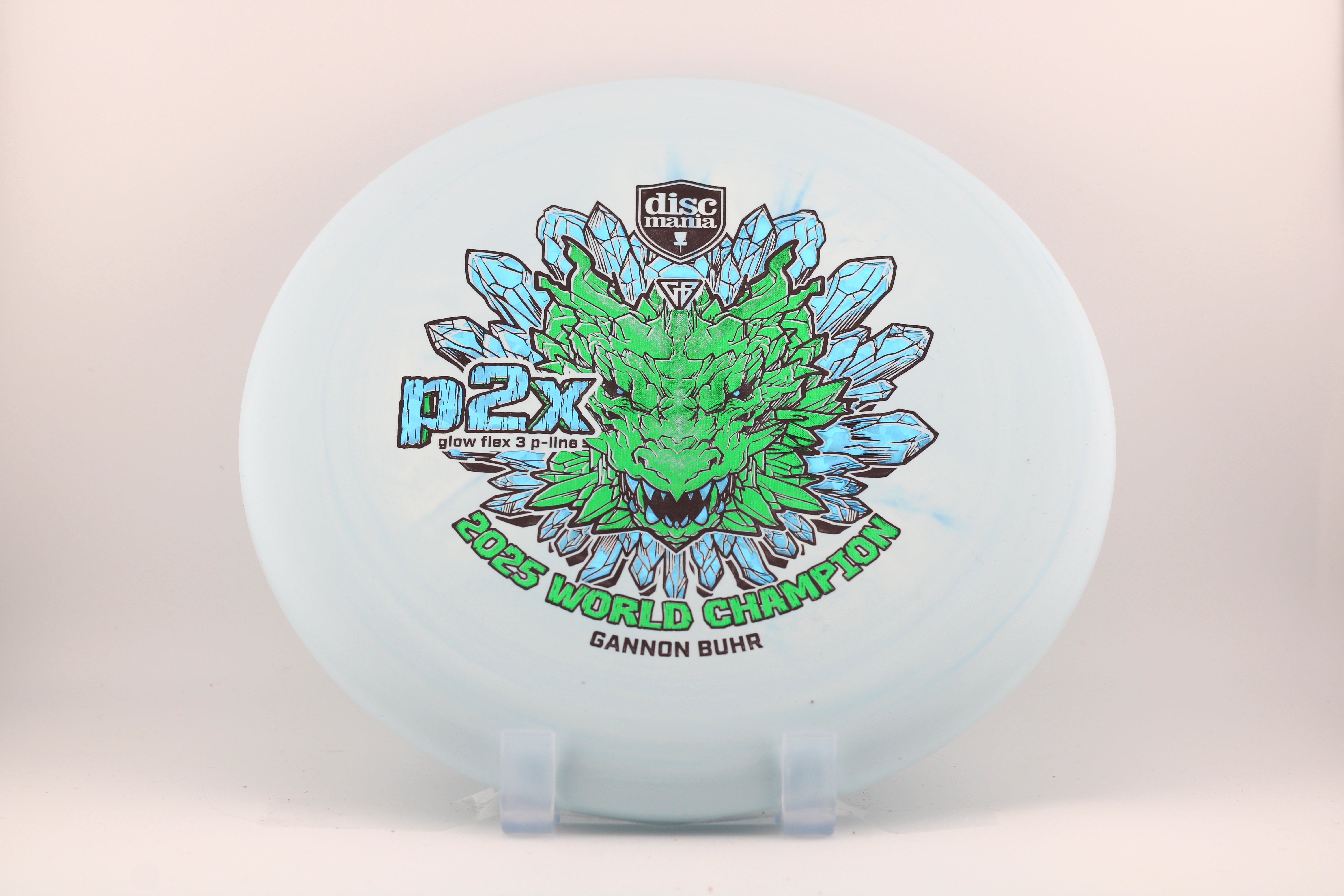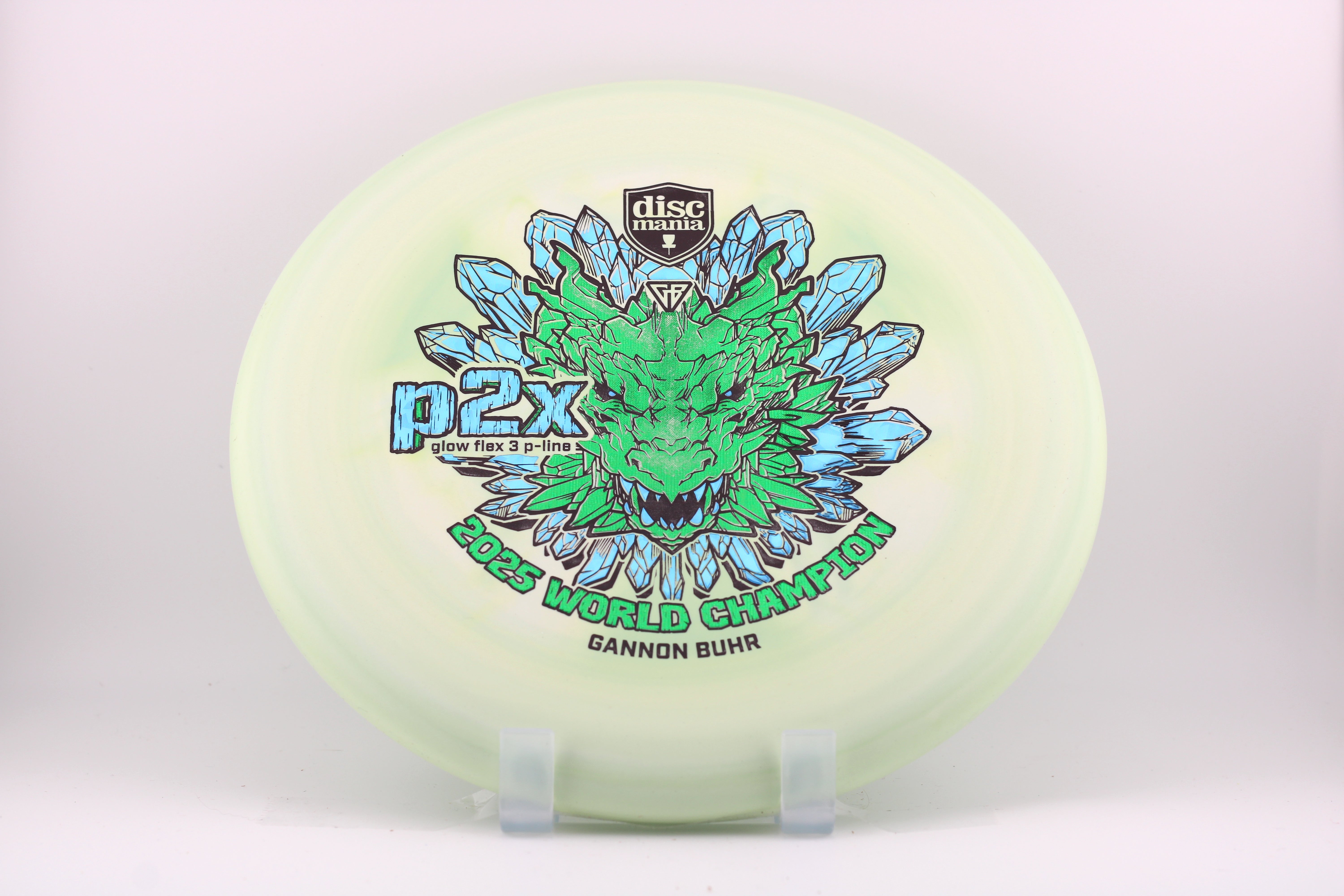 For the first time the P2x is available with the stiffest version of the Discmania P-Line plastic. It’s the most durable base plastic ever made. It offers an exceptional combination of grip, durability, and performance, making it a perfect choice for players who want reliable feel and consistent flight paths. A fierce dragon head symbolizes power, strength and dominance. Just like what we saw from Gannon at the 2025 Worlds in Finland. Now it’s your time to pick up a piece of disc golf history.
