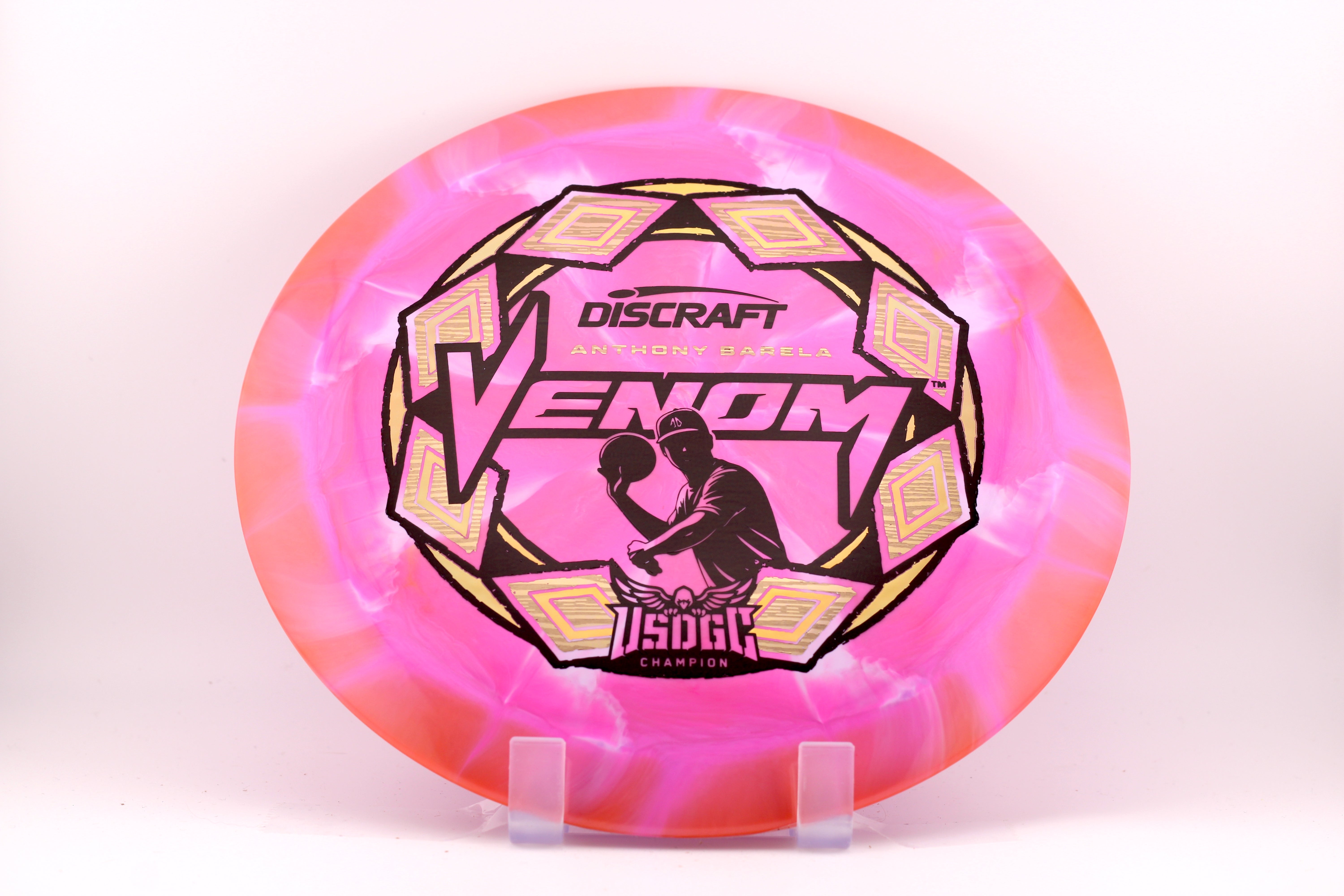 A max-speed, overstable distance driver built for big arms, the Venom shrugs off torque and headwinds, tracking each line before a hard, late fade that bites down fairways and skips into position. The refined rim feels fast yet secure, rewarding full-power backhands and confident forehands with predictable overstability and plenty of finish. Tuned to echo the beloved Test Flight Venom, this run pairs tour-level grip with eye-catching swirls and the durability big arms demand.